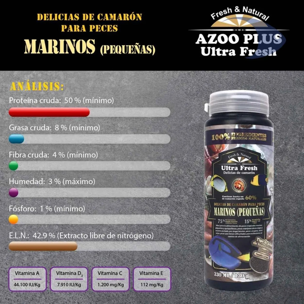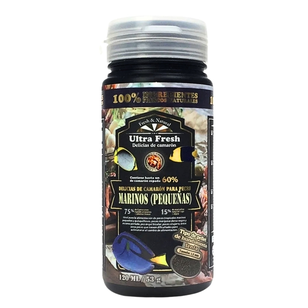 Alimento especializado en formato de bolitas (1.5 mm) para peces marinos pequeños de 53 gramos. Formulado con una proporción 8:2 de ingredientes cárnicos y vegetales, proporciona una nutrición balanceada que se adapta a especies selectivas o con dificultades de adaptación en cautiverio.