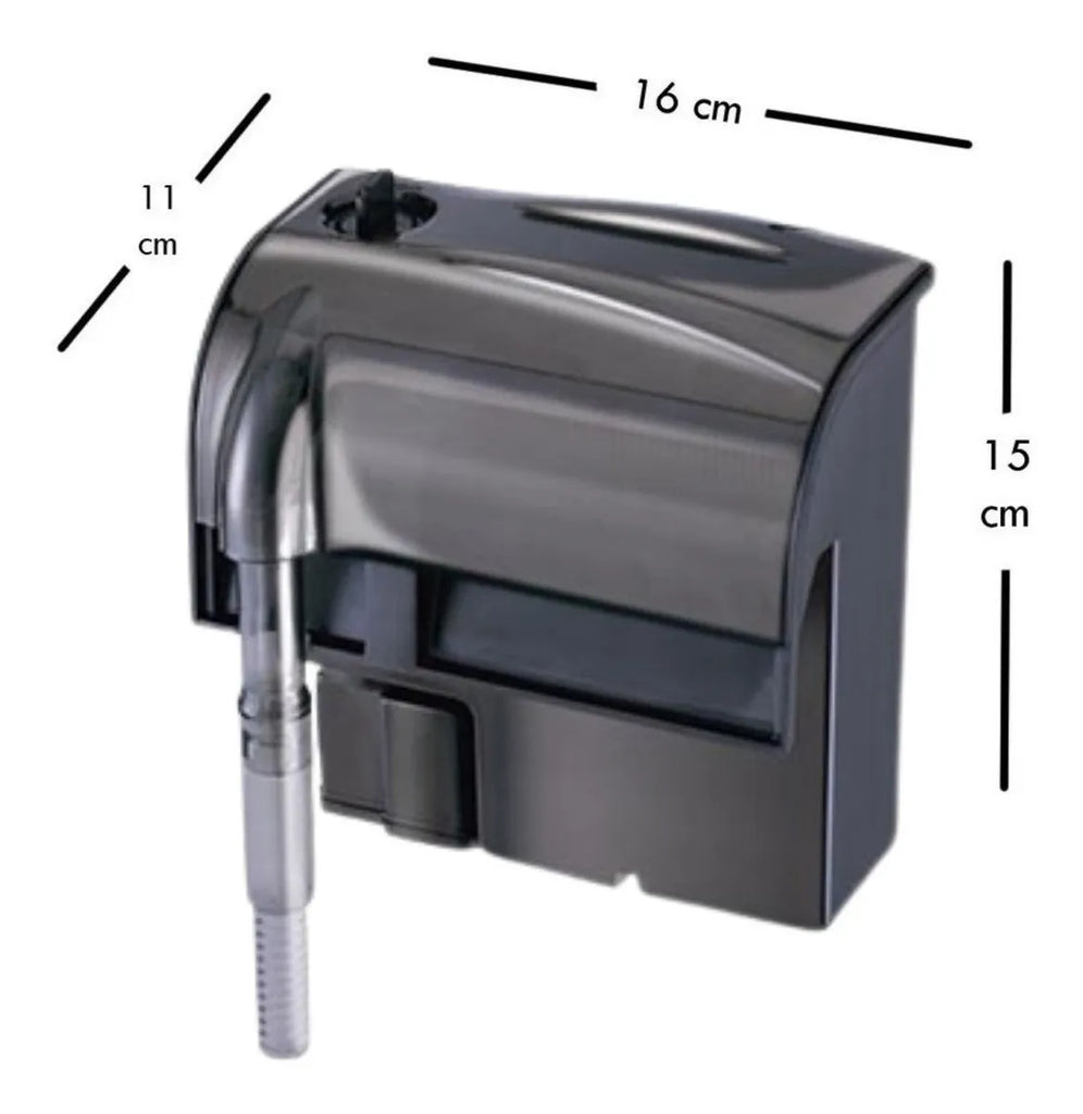 Filtro de cascada compacto (10x16x17 cm) para acuarios de hasta 80 litros. Opera con una potencia de 4.5W y un caudal ajustable de hasta 7.5 l/min (controlable al 70%), ofreciendo filtración triple: mecánica (esponja), química (carbón activado) y biológica.