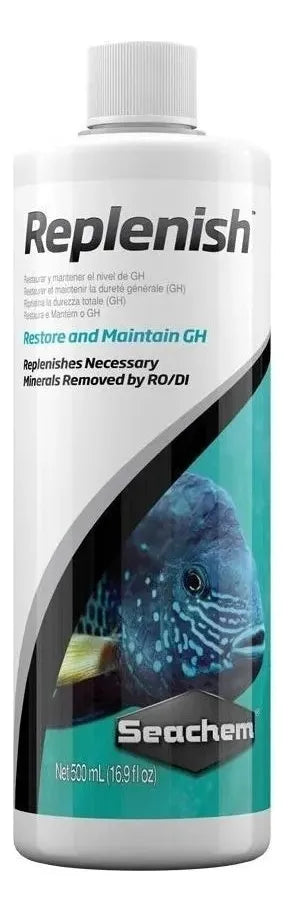 Seachem Replenish es una mezcla equilibrada de sales minerales diseñada para reponer los minerales esenciales que se eliminan al usar agua de ósmosis inversa (RO) o desionizada (DI). Restaura de forma segura la dureza general (GH) mediante una combinación precisa de sodio, potasio, calcio y magnesio, ayudando a prevenir el estrés osmótico y manteniendo a los peces en condiciones fisiológicamente estables.