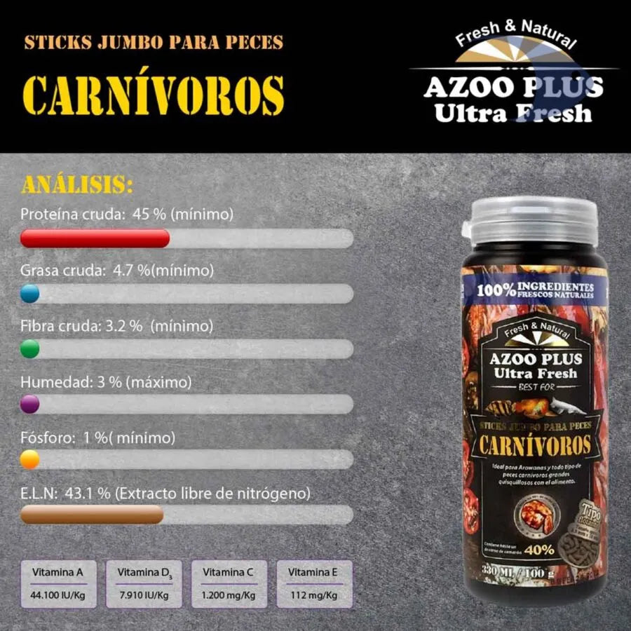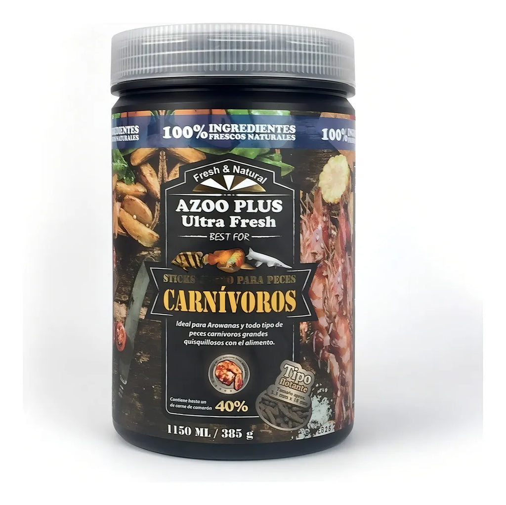 Alimento en formato de sticks flotantes de gran tamaño (385 g), diseñado específicamente para peces carnívoros grandes como arowanas, oscares y otros depredadores exigentes. Elaborado con ingredientes 100% naturales, incluye un 40% de camarones espada frescos de Yilan (Taiwán), que estimulan el apetito y mejoran la palatabilidad.